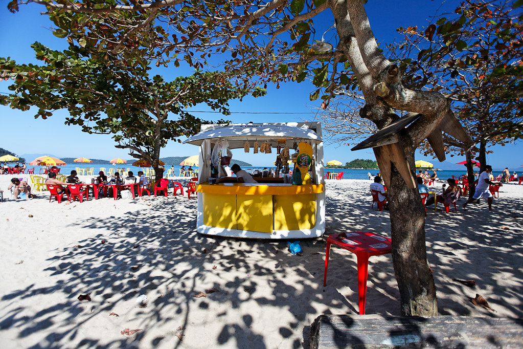 Nous sommes le 14 août 2009, nous avons posé nos valises pour deux jours dans le village de Mambucaba, il est 11 heures 15, le soleil monte avec la température ( » qu’est-ce que ce doit être en plein été ! » nous demandons-nous toutes les heures), nous sommes sur la plage, les enfants jouent dans le sable et le paysage somptueux s’étire devant nos yeux (une eau magnifique et surtout des montagnes couvertes d’une jungle bien épaisse – la mata atlantica – qui plonge en ne s’arrêtant qu’à quelques mètres de l’eau sur le sable ou les rochers, qui enserrent la baie ou nous nous trouvons) et Valérie s’interroge : » c’est à partir de quelle heure que je peux me commander une caïpirinha ? » Devinez ce que je lui ai répondu. Quoi qu’il en soit, une heure après, terrassés par la fatigue, nous nous dirigeons d’un pas déterminé (ou mou ? tiens, je sais plus …) vers la terrasse abritée de la gargote de la plage, où nous avons commandé un joli et délicieux plat de poissons et crevettes frits ! On en avait tous les cinq les mandibules qui ronronnaient, dites-donc. En ce qui me concerne, j’ai essayé de finir le repas sur la plage par une petite glace à l’açaï (une baie amazonienne délicieuse et pleine de bonnes choses à l’intérieur qu’ils disent) … je dis essayer, parce que ma femme m’en a piqué plus de la moitié. Il y a des choses auxquelles on devrait penser dès le contrat de mariage.