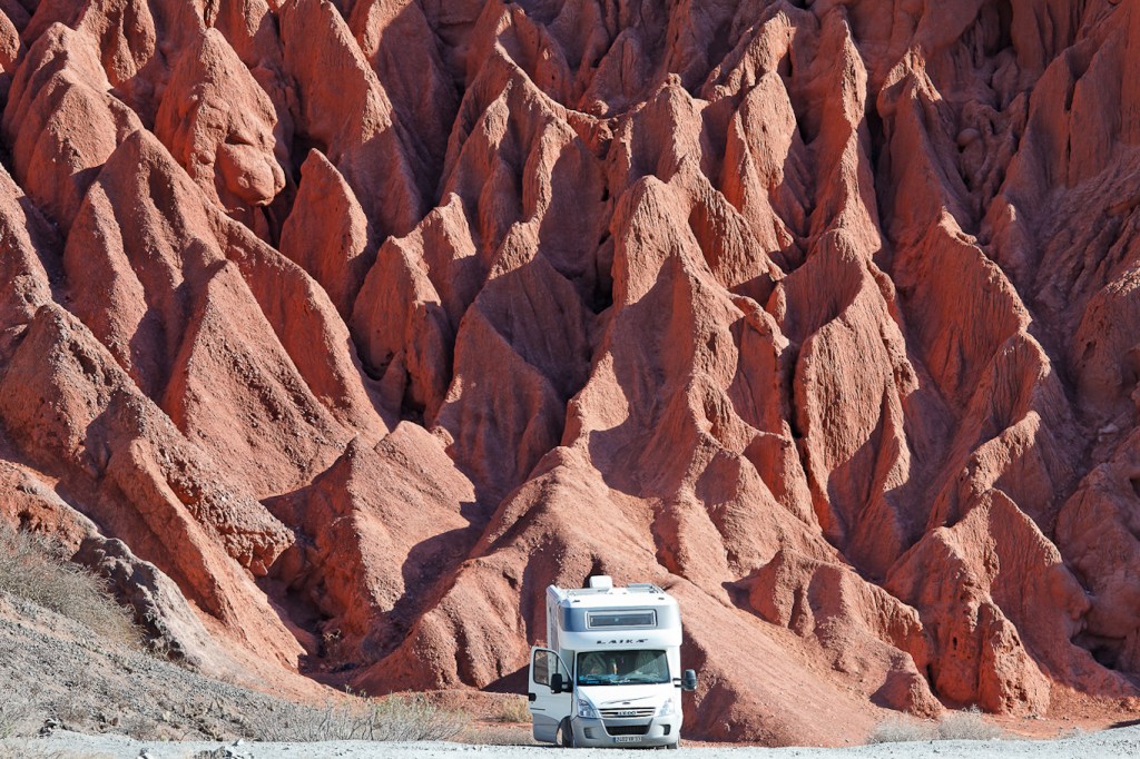 Nous passons un bref bivouac à Susques, un petit village Andin niché à environ trois mille mètres d’altitude, où nous parvenons à échanger notre bouteille de gaz bolivienne contre une bouteille flambante (façon de dire) neuve argentine : le chauffage, l’eau chaude et le frigo sont de retour chez les baluchons … il était temps ! Non sans mal tout de même : nous essuyons un premier refus dans une épicerie, et la seconde manque de nous réserver le même sort. La tenancière, méfiante, prend notre bouteille et la compare sous toutes les coutures (la couleur n’est pas la même) : diamètres, hauteur, raccord, etc. Finalement, elle nous la reprend et pour la récompenser – et uniquement pour celà – nous lui achetons en prime un pot de dulce de leche (que nous aurons fini dès le lendemain matin !) Nous étions en rupture de propane depuis une bonne semaine, et il était impossible de se réapprovisionner au Chili : les bouteilles y ont un format tellement exotique pour nous qu’il est à la fois impossible de les loger dans l’emplacement prévu à cet effet dans notre tampicar, et de les connecter à notre installation, et les usines de gaz les plus proches auprès desquelles nous aurions pu recharger directement les nôtres étaient à trois cent kilomètres de là. Autant vous dire que je suis plus motivé que jamais pour connecter notre réfrigérateur à nos panneaux solaires, sujet sur lequel je m’arrache les cheveux – je sais 🙂 – mais qui promet une réduction de moitié de notre consommation de gaz. Ici, en Argentine, la bouteille de 10 kilogrammes vaut environ 16 pesos (un peu moins de 3 euros) mais au Chili, il nous faudra parcourir plusieurs centaines de kilomètres entre deux usines de gaz : j’ai quelques semaines pour trouver une solution ! Amis lecteurs et camping-caristes, si quelqu’un a déjà réalisé un tel montage, je suis preneur !