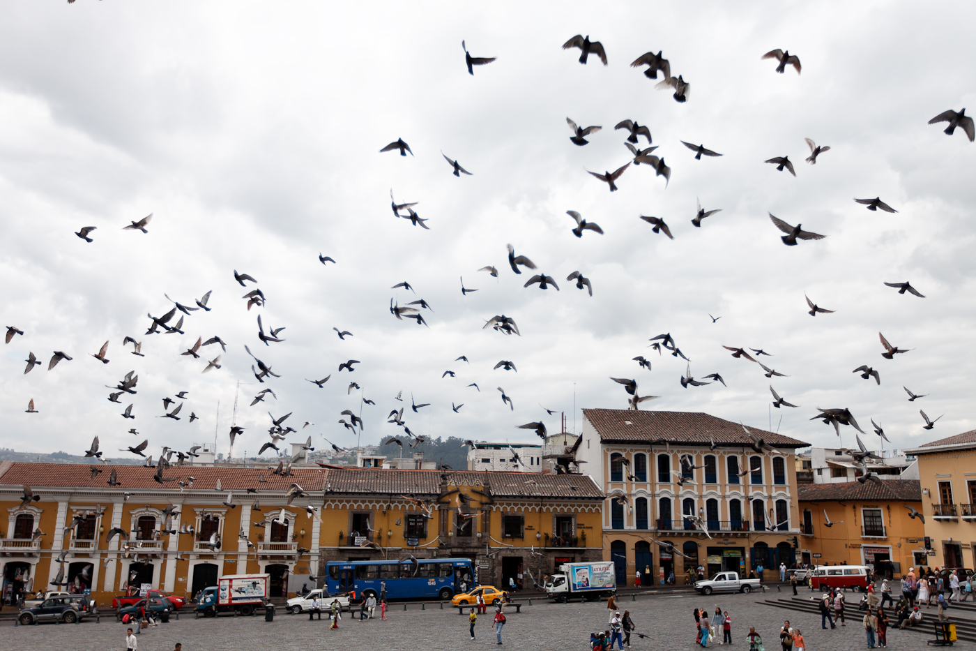 Nous terminons notre périple à neuf en visitant Quito, coincée entre plusieurs volcans et longue de près de trente kilomètres sur seulement quelques kilomètres de large. Son vieux centre colonial, classé au patrimoine mondial de l’Unesco, est très vallonné et a beaucoup de charme mais évidemment, ce n’est pas dans ce quartier aux rues étroites et escarpées que nous pouvons stationner, nous lui préférons donc la ville moderne où un très sympathique hôtel de style cubain (depuis, Christian, toujours avec dix idées à la minute, songe à faire une halte là bas, ce serait peut être le premier camping car français à Cuba, non ?) nous accueille pour trois jours.