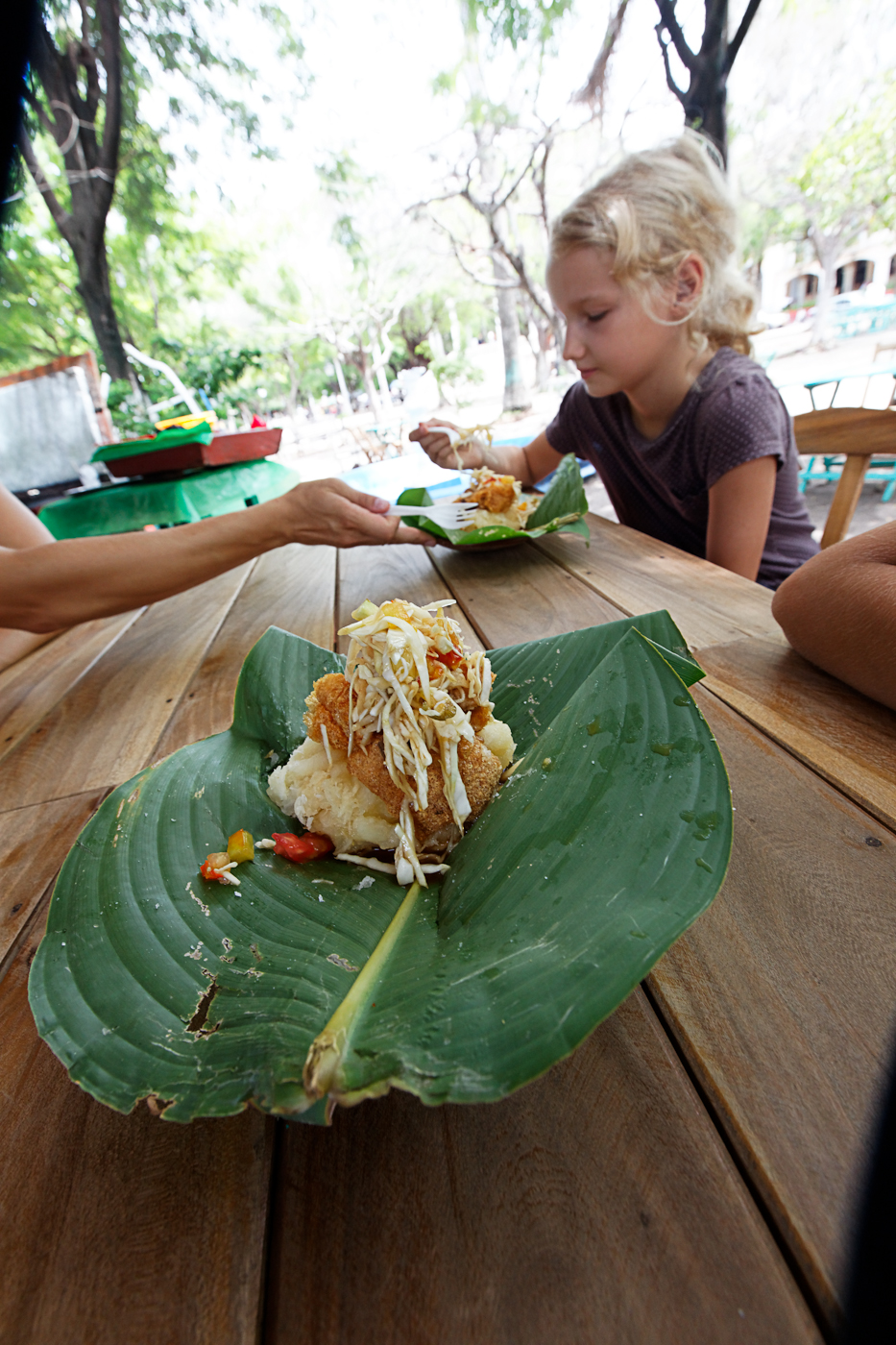 Quelques centaines de mètres, plus loin, je rejoins effectivement l’atelier, occupé nonchalamment par trois générations d’une même famille, et parmi eux un colosse de deux mètres de haut et à peine moins de large, pour lequel les cinq cents mètres qui le séparent de son chiffre d’affaires du jour semblent être une épreuve trop longue à effectuer à pied. Pour lui, c’est vélo : un vélo, pour lui … et moi. Je suis le client, donc le roi – ici aussi – donc pas question qu’il me laisse pédaler. Je me retrouve donc assis sur la barre transversale du cadre, mon gentil colosse plaqué tout contre moi – en photo, on pourrait croire à cet instant l’amitié franco-nicaraguayenne au plus fort, avantage Nicaragua quand même vu le gabarit, mais en réalité, ma préoccupation est purement sécuritaire : n’ayant pas trouvé d’autre point d’appui sur notre ridicule moyen de propulsion, tout mon poids repose sur mes deux vaillants berlingots, qui encaissent les vibrations de la route comme ils peuvent. Tout en restant très concentré, je me dis qu’il ne manquerait plus qu’un gros dos d’âne pour oublier à tout jamais mon projet secret de refiler un petit frère à Chloé.