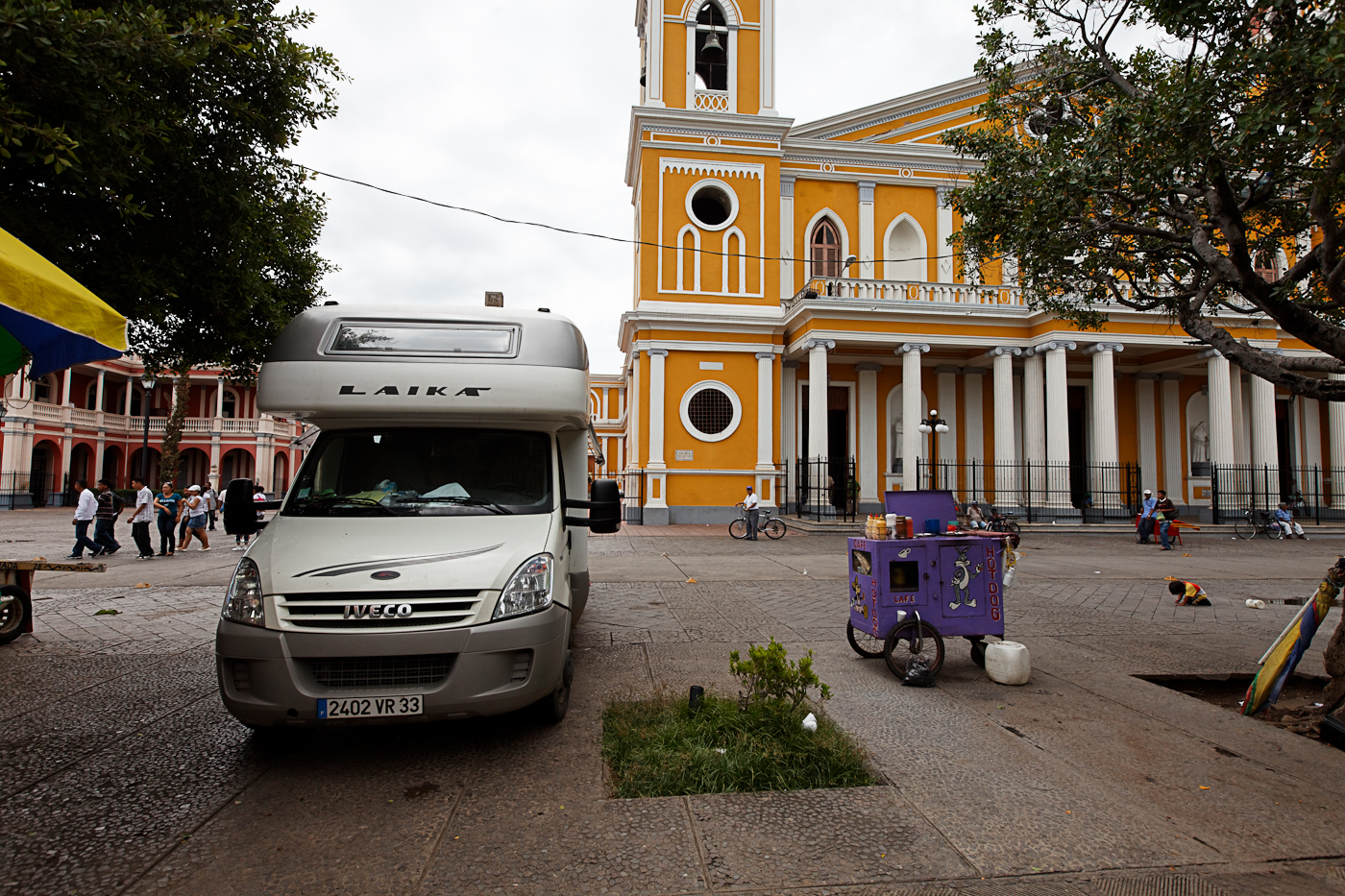 Nous attaquons la séquence par le Nicaragua et, passée une frontière un peu anarchique – et dire que, pour ce faire, nous avons doublé une file de 3 kilomètres de camions qui attendaient patiemment leur tour -, prise une petite photo des deux volcan de l’île de Ometepe, nous arrivons à Granada, ancienne capitale du pays. Là où nous attendions à trouver quelques jolis batiments par-ci par-là, nous tombons sur une ville magnifique, et nous décidons derechef de bivouaquer sur la place centrale, non sans avoir tenté auparavant une rue un peu plus calme. Nous préférons finalement nous » loger » sur un endroit plus visible et exposé – et pour la photo du bivouac, c’est quand même autre chose avec une cathédrale en toile de fond !