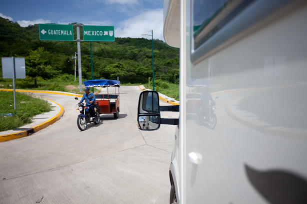 Notre premier contact avec le Mexique a valu le coup ! En effet, le 5 juin 2010 nous passons la frontière du Guatemala vers 17 heures, et les postes frontière des deux pays fermant à 18 heures nous avons de la marge. A peine ralentis par la minable tentative de corruption du fonctionnaire guatemaltèque que vous a raconté dans son dernier article ma Pamela Anderson de compagne, nous franchissons les grilles qui séparent les deux pays et nous retrouvons sur le parking du poste frontière flambant neuf du Mexique, dit de San Franscisco. Une fois n’est pas coutume, le préposé à la fumigation ne nous saute pas dessus pour demander des sous avant de nous asperger le chassis. Il nous montre les portes du bâtiment administratif, mais lorsque nous nous approchons c’est niet : fermé, nous dit-on !