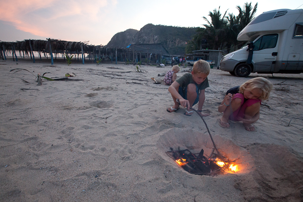 Avant de vous laisser, un petit mot sur le lieu de notre anniversaire de voyage. Nous sommes sur la côté pacifique du Mexique, dans l’état du Michoacàn, à Maruata. Nous n’avons pas trouvé LA plage de rêve que nous cherchions pour l’évènement, mais on a quand même pu se faire une soirée grillades de crevettes et chamallows fondus à la braise, à la belle étoile … D’où les quelques photos d’accompagnement ci-jointes, prise hier soir le 5 juillet 2010, où nous avons entre autres vainement essayé de faire du bulb-painting (dernière photo) ! Fin de soirée en écoutant de grosses vagues s’écraser en rouleaux à quelques mètres du tampicar, quelques étoiles filantes dans un beau ciel bien dégagé, le tout en sirotant mon dernier cigare, acheté il y a deux mois au Nicaragua …