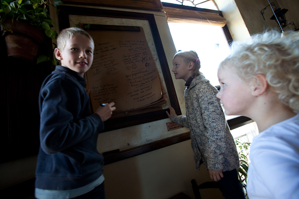 Ce jour là est aussi l’occasion de faire notre premier petit restaurant en famille, sans l’assistance de nos interprètes de Buenos Aires. C’est l’occasion de goûter un peu de tout, avec le sketche baluchonesque habituel : les enfants promettent d’être sages, nous entrons, nous asseyons, Hugo et Léna s’étripent illico presto pour la même chaise (et ce, quelle que soit la meilleure chaise : leur but est simplement de s’étriper en public), je gueule un coup, ce qui a pour seul effet d’inciter Chloé, jusque à présent spectatrice attentive à s’y mettre en renversant la moitié de la table d’une traction insignifiante sur la nappe, Valérie calme tout le monde en trois mots et demi, on nous amène la carte pendant que les enfants, fidèles à leur promesse de bien se tenir, scandent à tue-tête « des frites ! des frites ! des frites ! », nous essayons de nous faire expliquer un bout de la carte, choisissons deux plats correspondant à une des descriptions que nous avons comprises et commandons deux autres plats auxquels nous n’avons rien compris (c’est là que ce trouve le choix le plus vaste), déjeunons en jonglant entre les assiettes qui tournent de l’un à l’autre au gré des « j’aime pas ça », « j’en reveux de ça » ou « mais euuh Léénaaa elle en a eu plus que moaaaa », scène qui nous amène cahin-caha au café et à l’addition (étonnamment basse), pendant que les enfants taggent littéralement le panneau que la patronne a eu la mauvaise idée de nous indiquer pour que nous y laissions un mot… La vraie vie de famille, quoi.