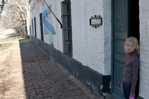 Nous partons ensuite nous balader en nous laissant prendre petit à petit par le charme de l’endroit, pas spectaculaire mais vraiment séduisant, allons visiter un musée sur la vie des gauchos (avec quelques armes d’époque qui laissent Hugo rêveur …), flânons autour d’un petit bout de prairie ouverte sur lequel quelques chevaux sont attachés pour le plus grand ravissement des enfants (surtout de Léna), vaquons aussi à quelques détails logistiques sur le camping-car et le reste, comme confier tout notre linge à une laverie… laquelle est tout le contraire d’être une laverie automatique (je n’en verrai pas en argentine, d’ailleurs, sauf peut-être une fois à Buenos Aires). Le fonctionnement est assez simple : un bac, c’est 20 pesos (soit à peu près trois euros cinquante) lavé, séché, plié, et le plus souvent le travail est fait dans la demi-journée… pas mal, non ? En soirée, je me promène avec mes deux filles vers les sanitaires publics du parc – quel père romantique fais-je donc, vous dites vous, et vous avez bien raison de vous le dire -, accompagné de ma fidèle boite Thetford (TM). Elles (mes filles, pas ma boite à m.) parviennent à me convaincre d’aller revoir les chevaux, si chevaux il y a. Il n’y en a qu’un, Léna tente d’engager la conversation avec lui, pendant que Chloé lui prépare un festin à base d’herbes cueillies à dix-huit centimètres du museau de l’animal, lequel ne doit pas bien comprendre ce qu’il a bien pu faire à cet espèce de tas de frisettes ambulant pour qu’il lui massacre ainsi son dîner.